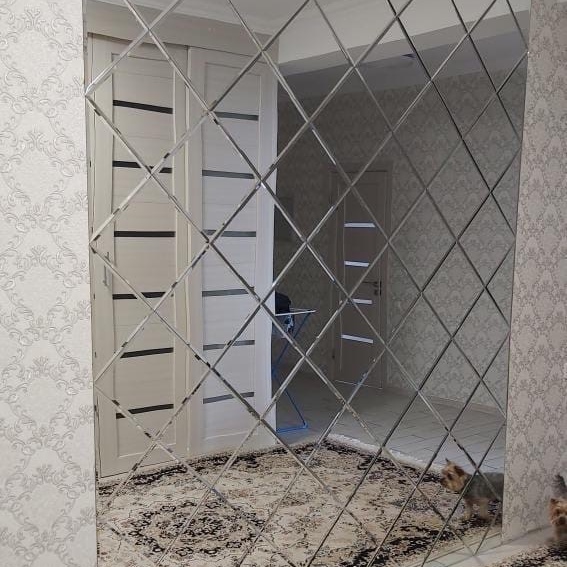 Использована квадратная серебристая зеркальная плитка размером 18х18.